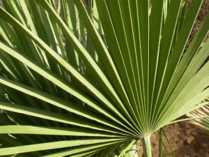 – Hojas. Tienen forma de abanico, son simples y grandes. La lámina foliar puede medir entre 11 y 43 cm de largo y 7 a 60 cm de ancho. Pueden variar desde verde oscuro hasta verde azulado o gris. Como en otras especies de palma, las hojas están divididas en segmentos triangulares hasta un tercio de su espacio, son estrechos, y junto a ellos hay fibras marrones. Además, poseen un pecíolo de 8,5 a 55 cm de largo y 0,2 y 1,5 cm de ancho con espinas amarillentas de unos 2,5 cm.