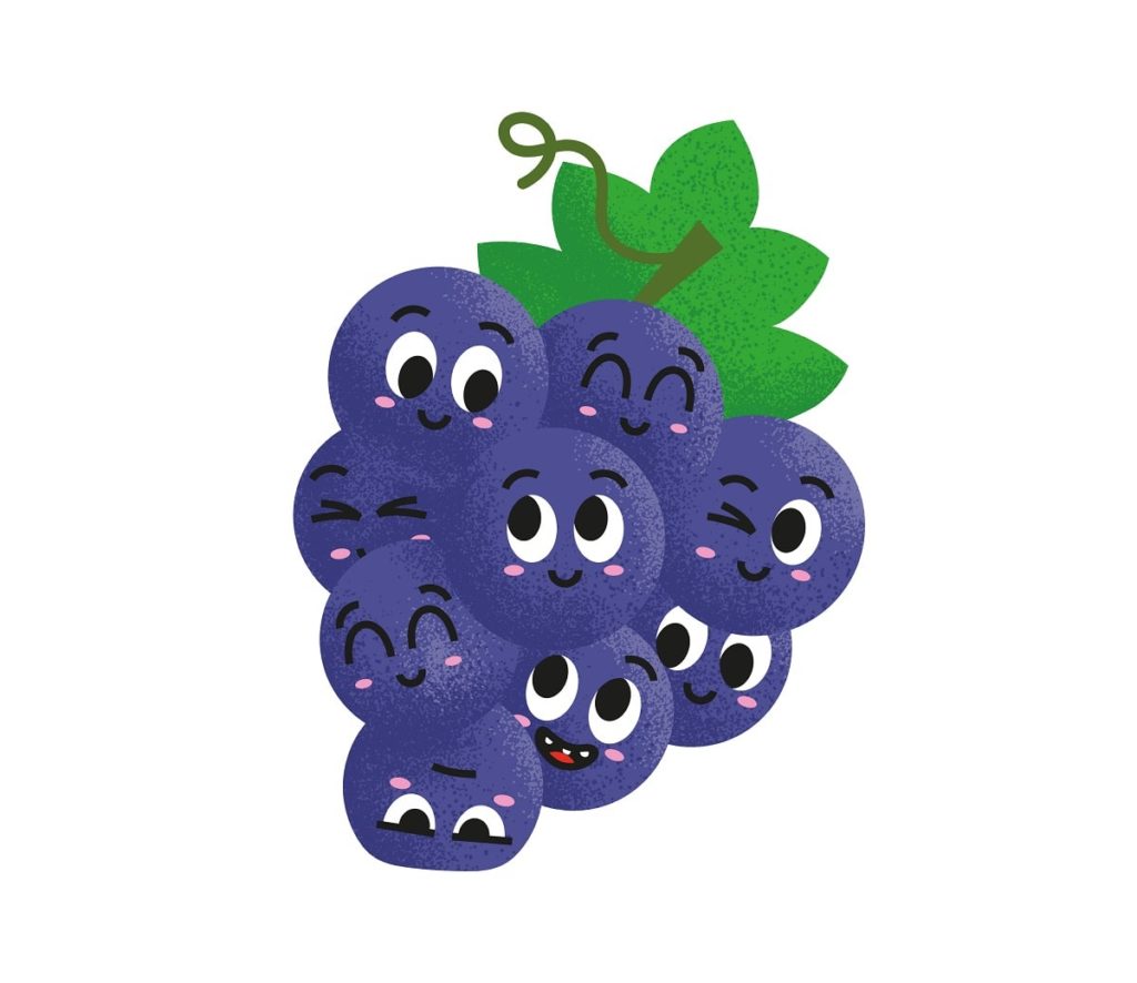 Una uva morada se encuentra con una uva verde que está jugando en el jardín y le dice: