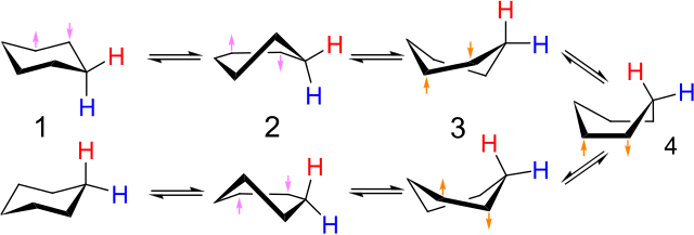 La imagen superior muestra un ejemplo de tales conformaciones para el ciclohexano. Nótese que el supuesto hexágono plano realmente parece más una silla (a la izquierda de la imagen) o un bote (a la derecha). Un hidrógeno se representa con letra roja, y otro con letra azul, para indicar cómo cambian sus posiciones relativas después de las inversiones.