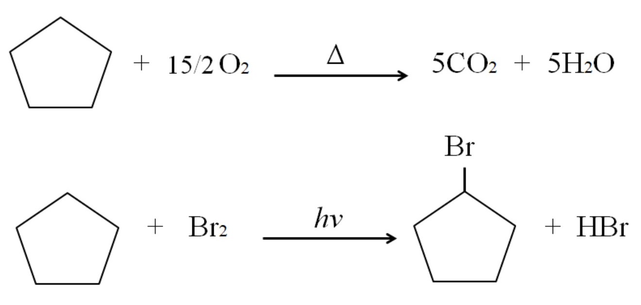 Arriba se muestra a modo de ejemplo las reacciones de combustión y halogenación para el ciclopentano. Un mol de él arde en presencia de calor y 7,5 moles de oxígeno molecular para descomponerse en CO₂ y H₂O. Por otro lado, en presencia de radiación ultravioleta y bromo, sustituye un H por un Br, liberándose una molécula gaseosa de HBr.