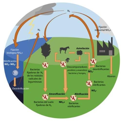 Las bacterias que viven en el suelo y en los cuerpos de agua son capaces de tomar este nitrógeno y convertirlo nuevamente en sustancias asimilables.