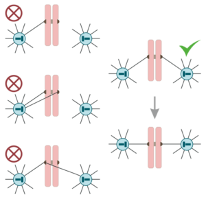 Uno de esos puntos de control implica que la célula “se asegure” que las fibras del huso mitótico están correctamente unidas a los cromosomas a través de los cinetocoros. Las fibras de los polos opuestos de la célula que se divide deberían estar unidas a cada una de las cromátidas hermanas, con el fin de separarlas correctamente.