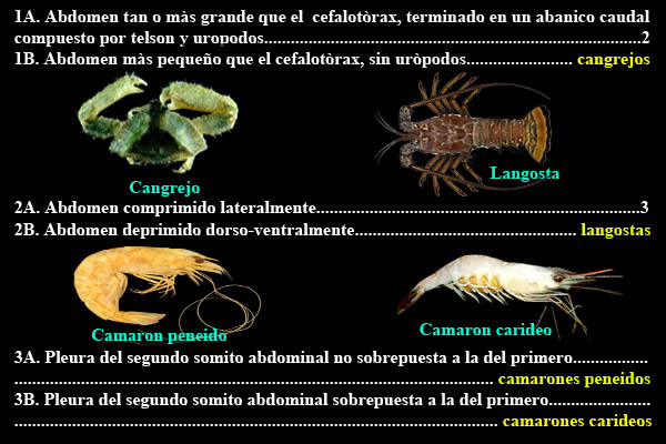 1A.- Crustáceos con el abdomen más grande que el cefalotórax, deprimido lateralmente. Pleura del segundo somito abdominal no sobrepuesta a la del primero. Primeros tres pares de patas usualmente quelados ……………………….…………………………….. camarones peneidos