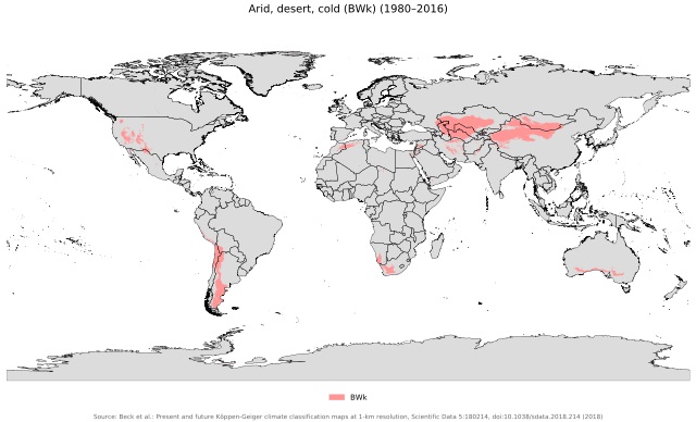 - Clima desértico templado o frío (BWk). Este tipo de clima se desarrolla usualmente en Asia, por lo que es poco común encontrarlo en otros lugares del mundo. Los desiertos fríos se localizan en zonas templadas que se enfrentan a una especie de sombra orográfica —es decir, un cúmulo montañoso que impide la introducción de las nubes en la superficie—, por lo que las precipitaciones resultan escasas. Existen varios desiertos BWk en el mundo, como el desierto de la Gran Cuenca (Estados Unidos), la meseta del Tíbet y el desierto del Gobi, en el sur de Mongolia. Estos desiertos se caracterizan por tener algunos días bastante cálidos, pero nunca son tan calientes como los desiertos BWh. Además, estas zonas son excepcionalmente frías, los inviernos son muy secos y las temperaturas siempre están por debajo de los 0°. Un dato interesante de los desiertos BWk es que son mucho más secos que los cálidos y se localizan a mayor altitud. En la Antártida y el Ártico se ubican regiones similares, aunque no se catalogan como desiertos BWk porque se les considera fenómenos propios del clima polar.