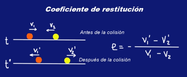 Donde e es un número real comprendido entre 0 y 1, llamado el coeficiente de restitución de la colisión. La expresión anterior se interpreta así:
