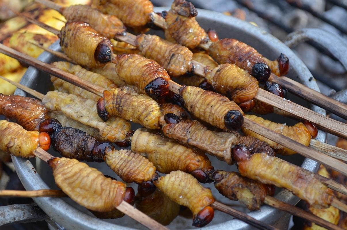 Las brochetas de suri son un plato muy fácil de preparar, el cual se elabora con una larva que se encuentra en el tallo del palmito y del aguaje.