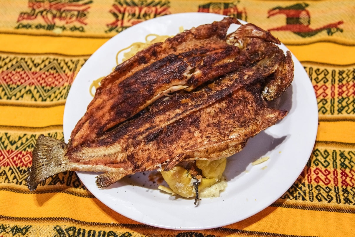 El ceviche es uno de los platos típicos de Perú, el cual está hecho con pescados de mar, aunque, en la selva peruana se realiza con paiche, que es un pescado muy grande que se encuentra en los ríos de la región.