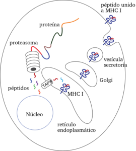 – Genes de la clase I. Los genes de la clase I del complejo mayor de histocompatibilidad codifican para unas glicoproteínas de superficie que se expresan en la mayoría de las células nucleadas del cuerpo humano. Estas proteínas están involucradas en la presentación de los antígenos de reconocimiento de las células T citotóxicas (antígenos foráneos). Es importante recordar que los linfocitos T citotóxicos tienen un importante papel en la inmunidad celular, específicamente en lo que tiene que ver con la eliminación de células que han sido invadidas por patógenos intracelulares de origen parasitario, bacteriano y viral. Así pues, las proteínas codificadas por los genes de la clase I del MHC participan directamente en la defensa del cuerpo contra agentes intracelulares extraños. Las proteínas de la clase I del MHC se unen a péptidos derivados de antígenos endógenos (producidos intracelularmente por un patógeno) que han sido procesados en el citosol y que son posteriormente degradados en el complejo del proteosoma. Una vez son degradados, estos son transportados al retículo endoplásmico, que los “empaqueta” y los dirige hacia la membrana con el fin de “cargarlos” o “unirlos” a las proteínas MHC clase I, en aras de que la célula sea reconocida por los linfocitos T citotóxicos. En los humanos, todos los genes del MHC se conocen como los genes HLA (Antígenos Leucocitarios Humanos) y los de la clase I son: HLA-A, HLA-B, HLA-C, HLA-E, HLA-H, HLA-G y HLA-F. Las moléculas codificadas por estos genes son un tanto diferentes en cuanto a su secuencia aminoacídica. Sin embargo, sus genes se expresan codominantemente en todas las células, es decir, que tanto los genes provenientes de la madre como los provenientes del padre se expresan al mismo tiempo.