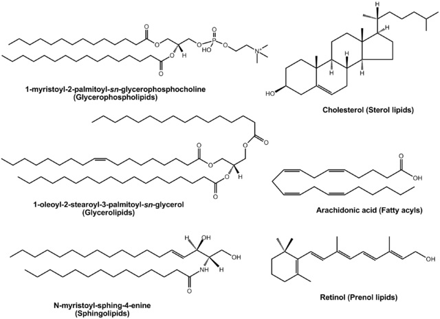 - Ácidos grasos y lípidos. Los lípidos son compuestos insolubles en agua que constituyen la sustancia fundamental de las membranas biológicas, elementales desde el punto de vista funcional y estructural de todas las células vivas. Son moléculas anfipáticas, es decir, moléculas que tienen un extremo hidrofílico y otro hidrofóbico. Están formados por cadenas de ácidos grasos unidas a un esqueleto carbonado, generalmente glicerol, cuyo tercer átomo de carbono “libre” está unido a un sustituyente particular que le da la identidad a cada molécula. Los ácidos grasos son hidrocarburos, es decir, compuestos únicamente por átomos de carbono e hidrógeno unidos entre sí. La asociación de múltiples lípidos en forma de bicapa es la que hace posible la formación de una membrana y las características de hidrofobicidad de esta estructura, así como la presencia de proteínas integrales y periféricas, hacen de esta una estructura semipermeable.