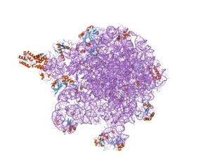 - Ribonucleótidos y ácido ribonucleico. Así como el ADN, el ácido ribonucleico es una biomolécula y es la que se encarga del proceso de unión de los aminoácidos que conforman a las proteínas, así como en otros procesos más complejos de regulación y control de la expresión génica. Es también un biopolímero, pero los nucleótidos que lo forman reciben el nombre de ribonucleótidos, pues el monosacárido que los estructura no es una desoxirribosa, como en el ADN, sino una ribosa. También poseen uno o más grupos fosfato y sus bases nitrogenadas difieren respecto a las del ADN en que no está presente la guanina, sino el uracilo (U).