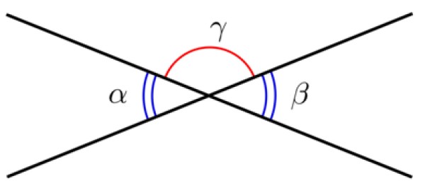Dos rectas con un punto en común definen dos ángulos, llamados ángulos opuestos por el vértice. Estos ángulos tienen la misma medida, por lo tanto son congruentes.