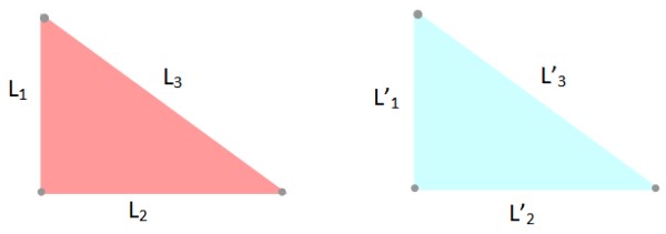 –Criterio LLL: los tres lados de los triángulos tienen las mismas medidas, por lo tanto L1 =L’1; L2 =L’2 y L3 =L’3.