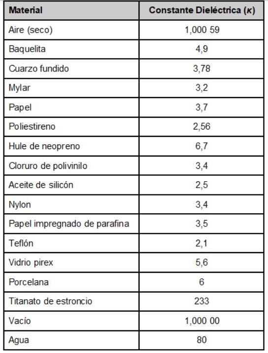 A continuación se presenta una tabla donde se especifica la constante dieléctrica de algunos materiales, donde las constantes dieléctricas no tiene unidades (son adimensionales):