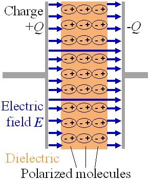 Debido a este fenómeno, el campo eléctrico dentro del dieléctrico es menor al campo eléctrico externo generado por el capacitor. En la imagen inferior se muestra un dieléctrico polarizado eléctricamente dentro de un capacitor de placas planoparalelas.
