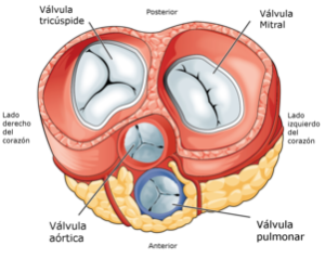 - Válvulas. El corazón posee cuatro válvulas unidireccionales que permiten el flujo sanguíneo en un solo sentido y evitan que la sangre se regrese cuando las presiones cambian, estas son: