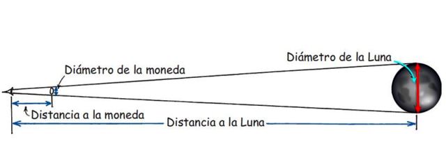 Cuando esto sucede, la razón entre el diámetro de la moneda y la distancia entre el ojo y la moneda, es la misma que hay entre el diámetro de la Luna y la distancia entre el ojo y la Luna: