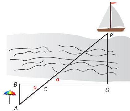 Para medir la distancia entre el barco y la orilla se clavan estacas en la playa en los puntos A, B, C y Q. Los triángulos ABC y PCQ son semejantes por el criterio 1, ya que tienen dos ángulos iguales: los dos ángulos ∠C = α que son opuestos por el vértice y los dos ángulos rectos iguales a 90º: ∠B = ∠Q.