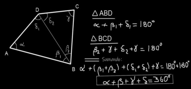 Por otra parte, se ha demostrado que la suma de los ángulos internos de un cuadrilátero suma 360°, es decir: