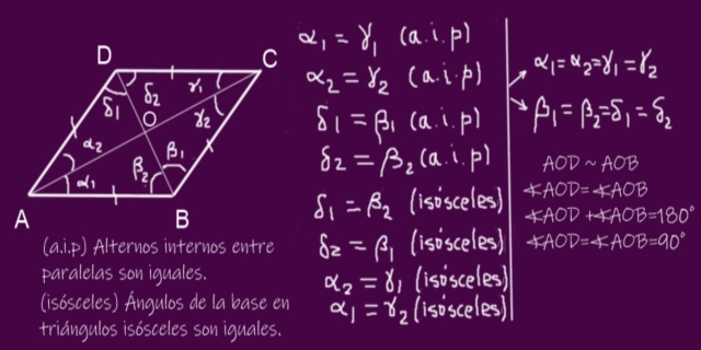 Es decir, queda demostrado geométricamente que las diagonales de un rombo se cortan en ángulo recto.
