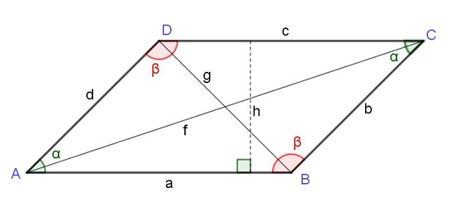 El cuadrado de la diagonal que parte de un vértice es igual a la suma de los cuadrados de los dos lados adyacentes a dicho vértice más el doble producto de esos lados por el coseno del ángulo de ese vértice: