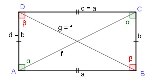 Es decir, que f = g, y por tanto, las longitudes f y g de las dos diagonales del rectángulo son iguales y su longitud viene dada por: