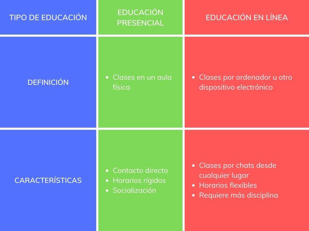 Este cuadro sirve para conocer algunas características y ventajas de cada tipo de educación. La educación presencial, por ejemplo, se realiza en un aula física, mientras que a distancia las clases se imparten por chats, blogs, foros, etc., a través de cualquier dispositivo electrónico con conexión a internet.