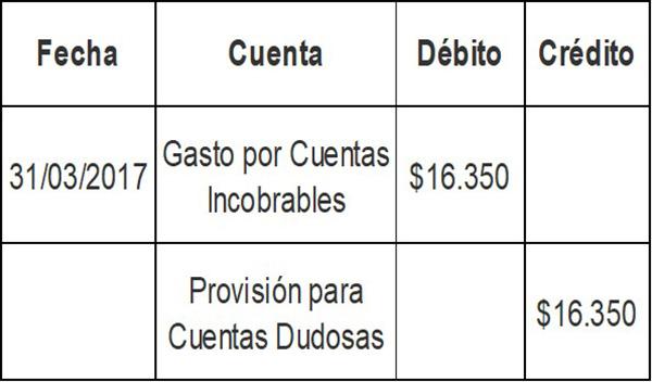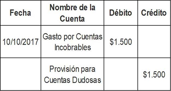 Esto se registra como un débito en la cuenta de gastos de cuentas incobrables y un crédito en la cuenta de provisión de cuentas dudosas.