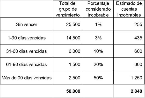 Este porcentaje suele ser diferente para cada grupo de vencimiento y se calcula basado en la experiencia pasada y las condiciones económicas actuales de las áreas donde la empresa realiza sus operaciones.