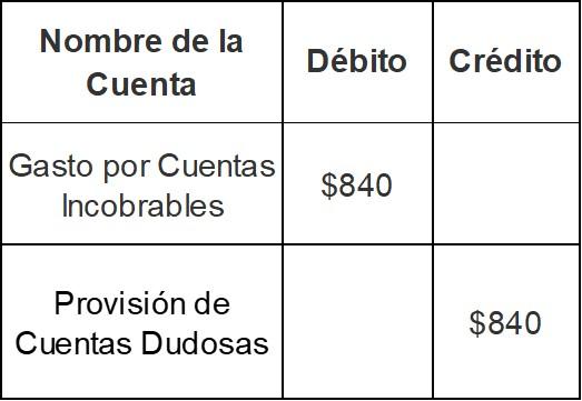 Con esta entrada, el saldo en la provisión de cuentas dudosas se incrementará de $2.000 a $2.840.