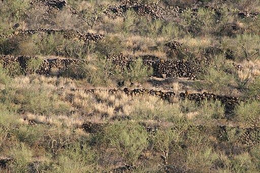 - Cerro Trincheras. Con respecto al segundo rasgo, el Cerro Trincheras, se encuentra en la parte media del valle del río Magdalena, al noroeste de Sonora. El cerro se eleva a más de 150 metros por encima del llano desértico de la zona, que desde lejos tiene un aspecto “rayado” por los 900 muros de piedra que construyó este grupo prehispánico. Esos muros van de los 10 a los 15 metros, pero pueden alcanzar los 150 metros de largo. Carecen de argamasa, es decir, las rocas se colocaron una sobre otra utilizando exclusivamente la gravedad, llegando a tener hasta 3 metros de alto. El Cerro de Trincheras tiene tres estructuras destacadas: