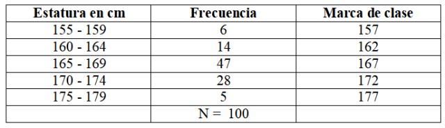 Para nuestro ejemplo, la primera marca de clase es (155 + 159)/2 = 157 cm. El lector puede comprobar que las restantes marcas de clase son: 162, 167, 172 y 177 cm.