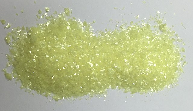 Una muestra recristalizada de dibenzalacetona debe lucir un brillo parecido al de los cristales de esta imagen. Fuente: Smokefoot CC BY-SA, Wikimedia Commons