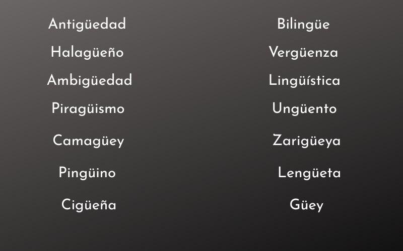 Agüera, agüío, agüista. Agüite, agüizote, alengüe, alengüé, alengüéis, alengüemos, alengüen, alengües. Ambigüedades, angüejo, antigüeño, apacigüe, apacigüéis, apacigüemos, apacigüen. apirgüinarse, aragüirá, argüe, argüendera, argüendero, argüí.
