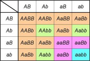 Estas, por supuesto, derivan de las proporciones genotípicas ordenadas 4:2:2:2:2:1:1:1:1 que se obtienen como resultado del producto de (A+a)2 X (B+b)2=(AA + 2Aa + aa) X (BB + 2Bb + bb).