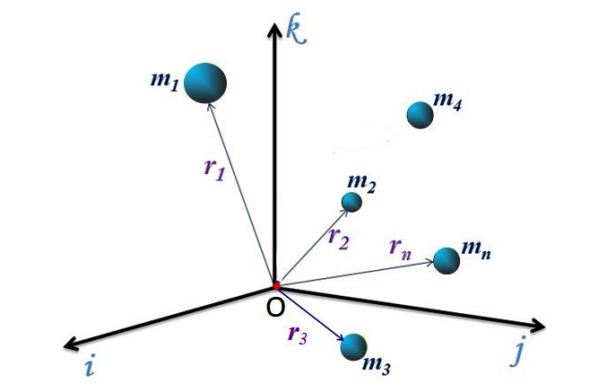 Para el sistema discreto de la figura 1, con n partículas, cada una tiene un vector de posición dirigido desde el origen O del sistema de coordenadas hasta el punto P(x,y,z) donde está la partícula. A estos vectores se los denota como r1, r2, r3… rn.
