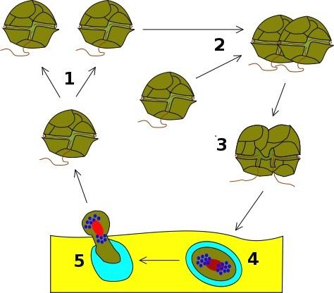 Ciclo de vida de un dinoflagelado. (1) Fisión binaria. (2) Unión de dos dinoflagelados. (3) Planozigoto. (4) Hipnozigoto. (5) Planomeiocito. Fuente: Wikimedia Commons