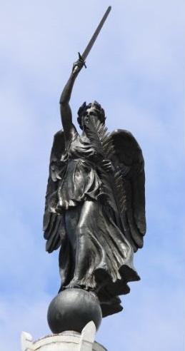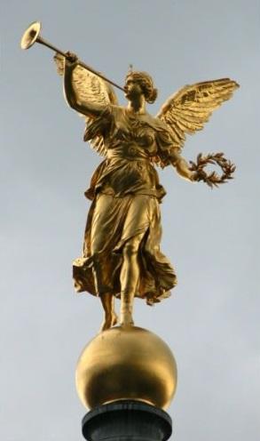 También es vista erigiendo un trofeo o registrando una victoria sobre un escudo. Con frecuencia se ve flotando con sus alas desplegadas sobre el vencedor en una competencia.