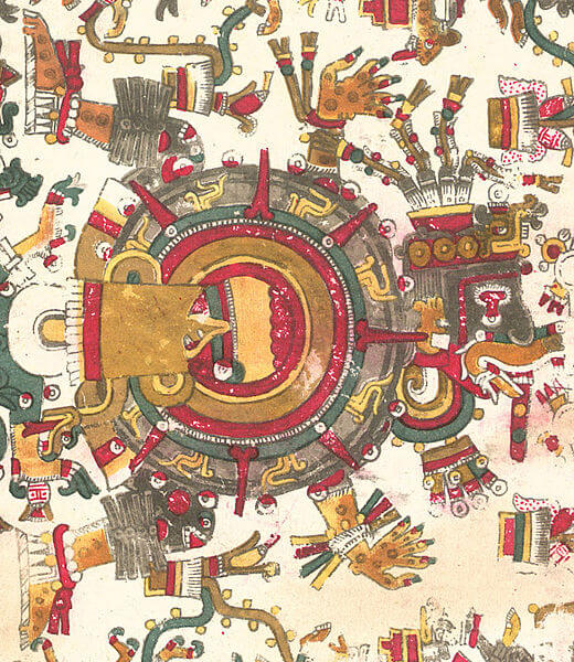 Un punto central de la mitología azteca es la teoría de los cincos soles, cada uno de los cuales representa una etapa histórica y sus cambios se dan por una catástrofe. Actualmente estamos en el quinto Sol.