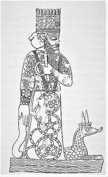 Su nombre varió a lo largo de la historia, tomando hasta cincuenta apelativos diferentes en el mito de la creación babilónico, o Enūma Eliš. Marduk fue representado como un ser humano junto a su dragón sirviente, Mušḫuššu.