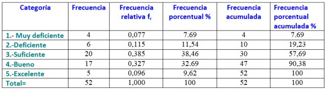 En este ejemplo las categorías o clases se corresponden con la calificación final que se asigna de acuerdo al porcentaje x de objetivos logrados: