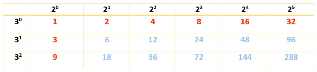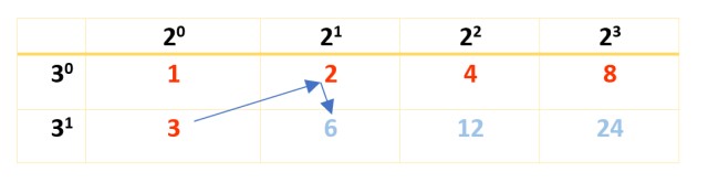 Nótese que las potencias de 2 comienzan en 20 y terminan en 23, que es el factor que surge al descomponer 120. Recuérdese que 20 y 30 ambos son igual a 1 (cualquier número elevado a 0 es 1). Para el factor 3, se comienza en 30 hasta 31, ya que 31 = 3.