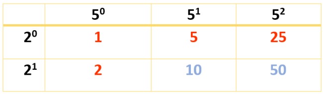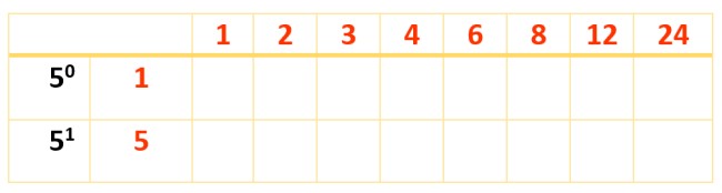 Todos los números en rojo y en azul son divisores de 120, pero apenas hay 8. Para hallar los restantes, se contruye una nueva tabla, se escriben los divisores ya obtenidos en la primera fila y el factor que falta por tomar en cuenta: el 5, con sus potencias en la primera columna, a la izquierda, así: