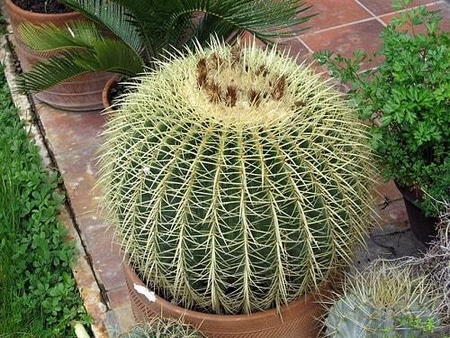 La especie Echinocactus grusonii se denomina comúnmente asiento de suegra, cojín de suegra, bola de barril, bola de oro o cactus erizo. La estructura del cactus es de apariencia globosa, de color verde y puede alcanzar más de un metro de diámetro.