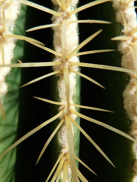 - Presenta numerosas espinas de color amarillo brillante las más jóvenes, luego más pálidas y las mayores de tonos pardos. Areolas alargadas, grandes, distantes y divergentes, con una pelusa amarilla sobre las localizadas en el ápice.