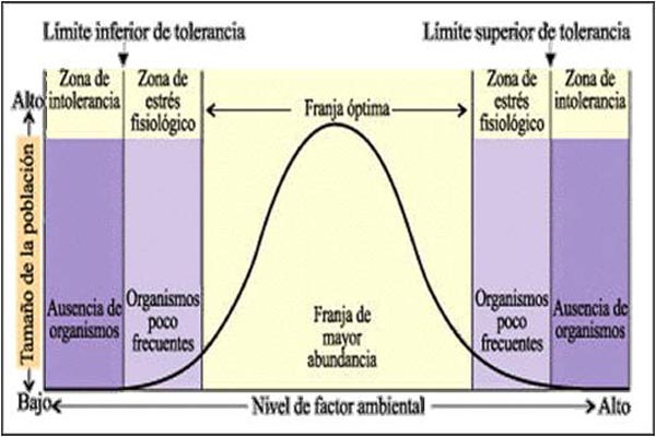 - Ley de la tolerancia de Shelford. En 1913, Víctor Shelford planteó que una especie determinada existe en una amplitud de variación definida para cada factor ambiental y sus interacciones. Es lo que se conoce como límites de tolerancia, fuera de los cuales la especie no sobrevive. Este principio define que en la amplitud de variación de un determinado factor ambiental existen tres estados posibles para el organismo: el óptimo, el estrés fisiológico y la intolerancia. En este sentido, en la franja óptima del factor, las poblaciones de la especie serán abundantes. Al alejarse del óptimo, se entra en una zona de estrés donde las poblaciones disminuyen, y fuera del límite de tolerancia, la especie desaparece.