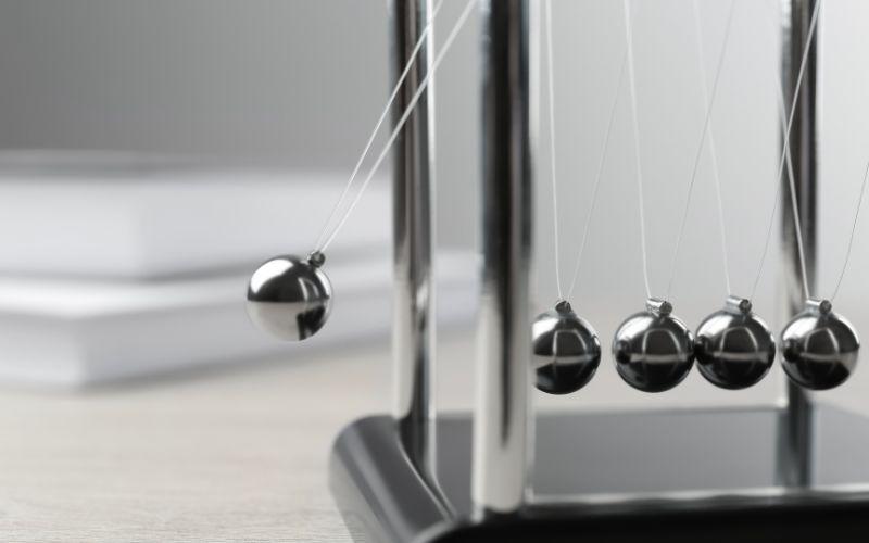 - Balanceo de bolas de acero. Si se balancea una bola dura hacia atrás y se suelta para que colisione con la siguiente bola, se moverá la que se encuentra en el extremo opuesto, si se realiza el mismo procedimiento, pero se toman dos bolas y se sueltan, en el otro extremo se balancearán dos bolas también. Este fenómeno se conoce como colisión casielástica, en donde la pérdida de energía cinética producida por las esferas en movimiento y su choque entre ellas es mínima.