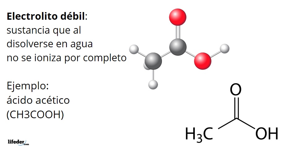 El ácido acético, CH3COOH, es un ejemplo de un electrolito débil. Su molécula posee un grupo funcional que caracteriza su acidez en el agua. Sin embargo, cuando se disuelve no todas sus moléculas producen iones H3O+ transformándose en el anión acetato, CH3COO–, sino que permanecen neutras, protonadas.