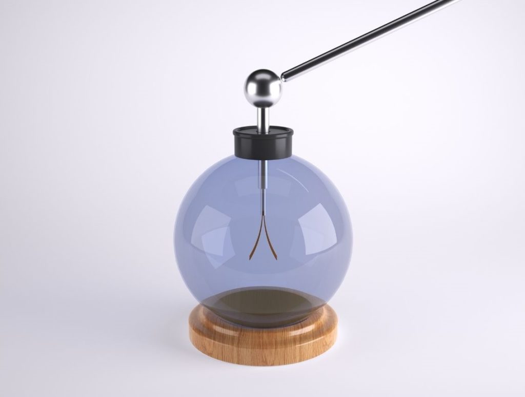 La configuración de este electroscopio es muy parecía a la estructura que se conoce hoy en día: el dispositivo estaba conformado por una campana de cristal que tenía una esfera metálica en el extremo superior.
