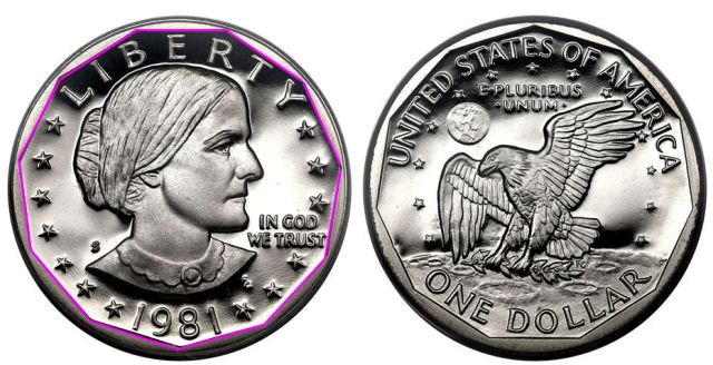 En la figura siguiente se muestra un endecágono regular en el contorno interno de un dólar estadounidense con la figura de Susan B. Anthony (1820-1906), una activista de los derechos de las mujeres nacida en Massachusetts, Estados Unidos. El endecágono también se ha usado como parte del diseño de otras monedas por todo el mundo.
