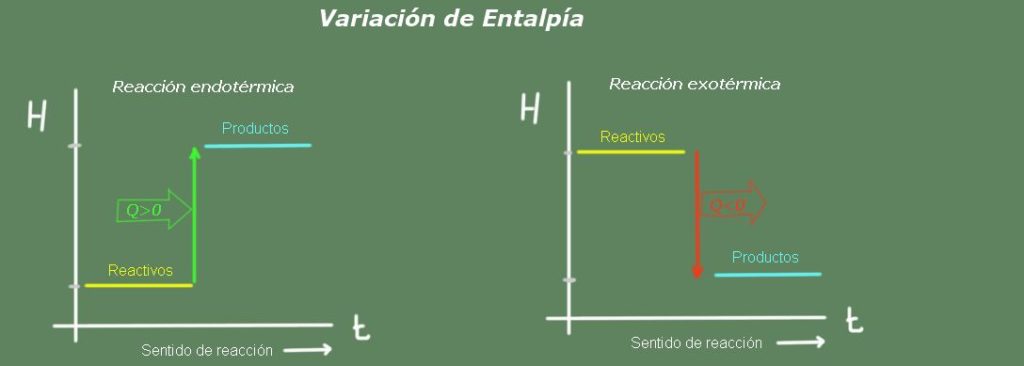 En una reacción endotérmica, la entalpía de los productos es mayor que la de los reactivos, es decir, la reacción toma calor del ambiente. Por el contrario, en una reacción exotérmica la entalpía de los reactivos es mayor que la de los productos, ya que la reacción cede calor al ambiente.